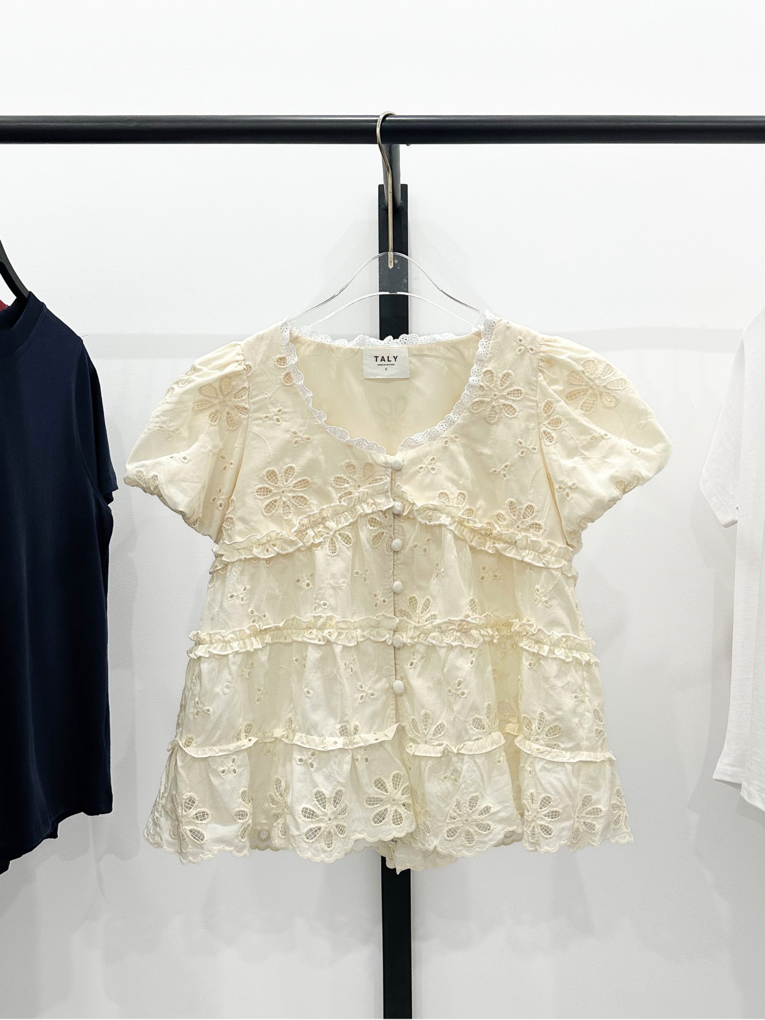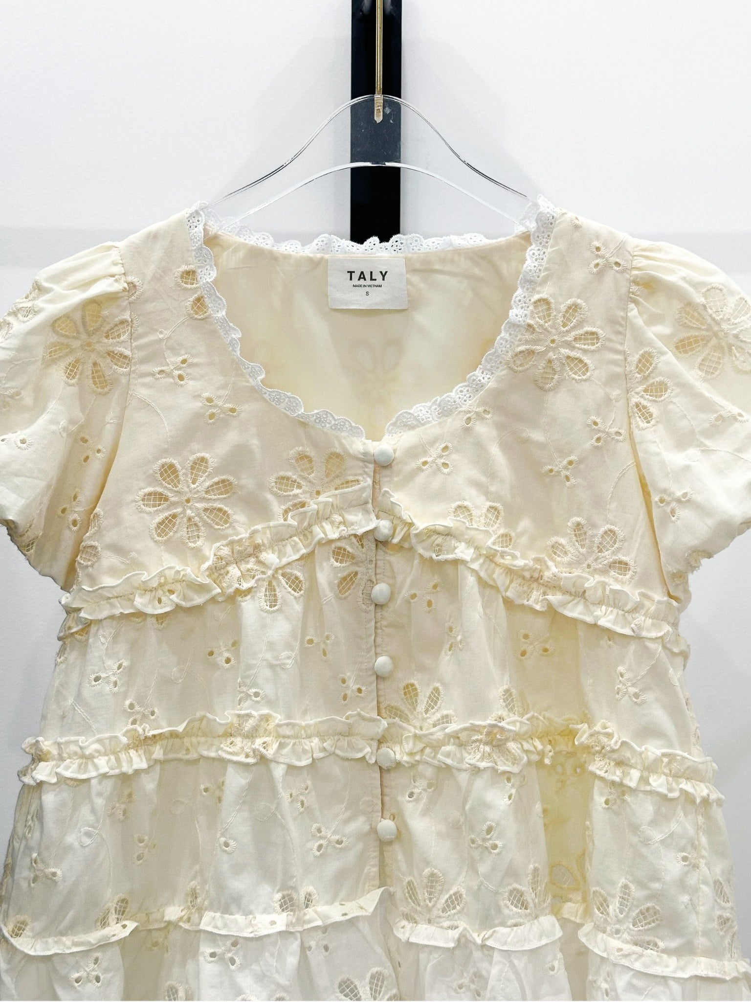 - Chất liệu: Chất boi thêu hoa, phối viền ren cổ, phần thân được may đúp lót kèm lót lụa mềm mịn, tay form bí, mặc thoải mái